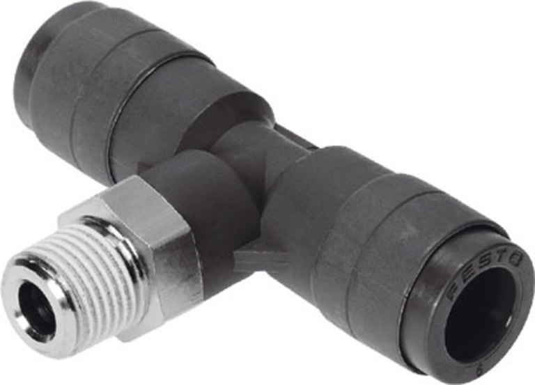 Push-in T-fitting QST-V0-3/8-12 360ø orientable, male thread with external hexagon. Size=Standard, Nominal size=10 mm, Material fire test=(* UL94 V-0 (housing), * UL94 V-0 (releasing ring)), Type of seal on screw-in stud=coating, Design structure=Push/pull principle