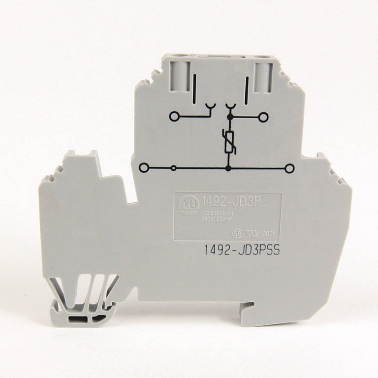 1492-J IEC Terminal Block, Two-Circuit Feed-Through Block, 2.5 mm (# 24 AWG - # 12 AWG), Selectable component plug-in device with internal surge suppression, Gray (Standard)