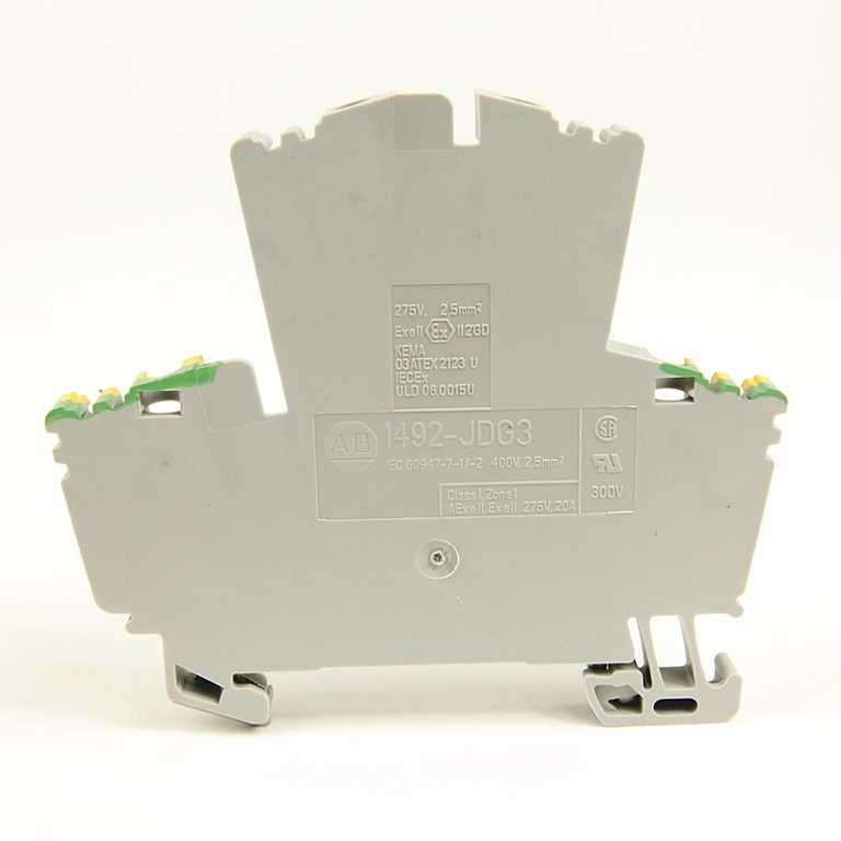 1492-J IEC Terminal Block, Two-Circuit Feed-Through Ground Block, 2.5 mm (# 24 AWG - # 12 AWG), 4 Connection points, Green / Yellow Stripe (Standard)