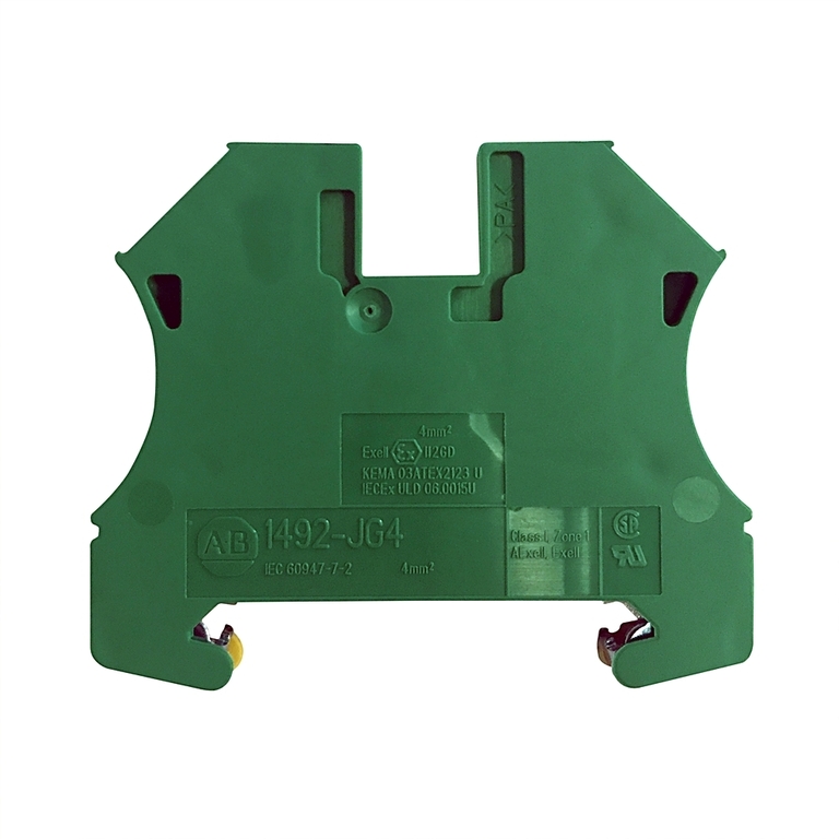 1492-J IEC Terminal Block, One-Circuit Feed-Through Ground Block, 4 mm (# 22 AWG - # 10 AWG) or 2.5 mm (# 22 AWG - # 12 AWG), Standard Feedthrough, Green / Yellow Stripe (Standard)