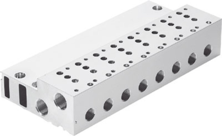 Manifold block MHA4-PR8-3-1/4 For sub-base valves MHA4-... Max. number of valve positions=8, Corrosion resistance classification CRC=2 - Moderate corrosion stress, Product weight=1400 g, Mounting method for sub-base=(* with through hole, * with top-hat rail), Mounting method for valve=with internal (female) thread